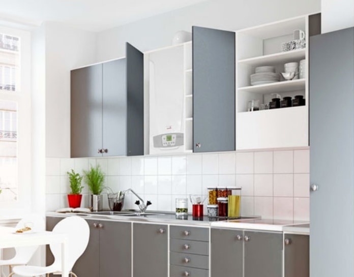 Pour une installation dans un meuble de cuisine ou autre placard, les chaudières à condensation murales restent la meilleure solution. En effet, leur circuit d’évacuation des fumées est étanche, ce qui, d’un point de vue réglementaire, leur permet d’être facilement installées n’importe où. Vous pouvez donc envisager d'installer votre chaudière dans une cave, dans des WC ou encore dans une salle de bain.